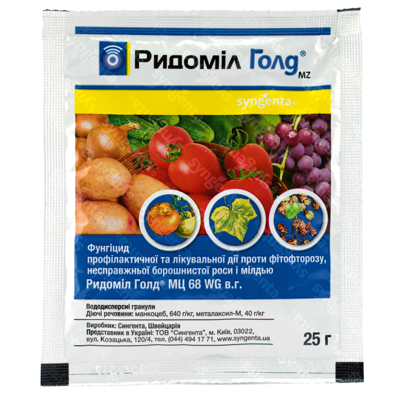 Ридоміл Голд R – фунгіцид, що має системну і контактну дію, застосовується на винограді, овочах, картоплі з метою запобігти виникненню мілдью, пероноспорозу, фітофторозу, альтернаріозу, бактеріальних хвороб. Може використовуватися також з лікувальною метою, після виявлення перших ознак захворювань на рослинах.