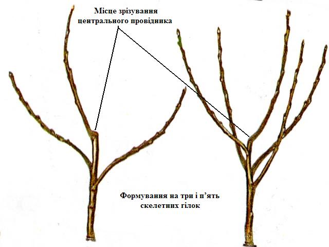 Видаляють вертикальні пагони («волчки») та гілки, спрямовані всередину крони. Залишають 6-8 скелетних гілок, формуючи чашоподібну або напівчашоподібну форму.