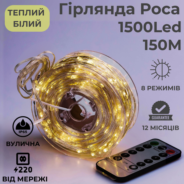 Характеристики товару: · Довжина: 150 метрів · Кількість LED ліхтариків: 1500 LED · Тип освітлення: крапля роси, мікролед · Режими: 8 режимів включаючи постійне …
