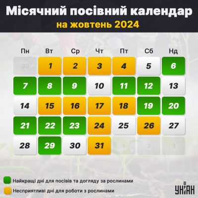 Сприятливі дні для посадки і пересадки рослин: 4, 5, 6, 9, 10, 11, 14, 15, 18, 19, 22, 23 жовтня. Несприятливі дні: 2, 7, 8, 12, 13, 17, 20, 21, 24, 25, 26 жов …