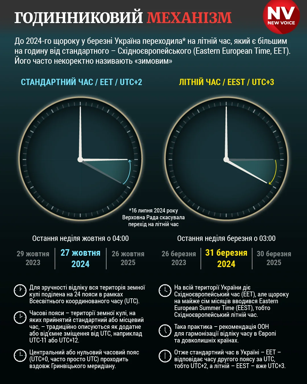 Перехід на зимовий час відбудеться в ніч з 26 на 27 жовтня 2024 року. · Годинники переводять на годину назад о 4:00 за київським часом.