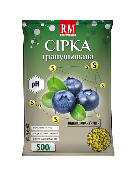 Гранульована сірка для лохини, поступово розкладаючись, на тривалий термін забезпечує рослинам оптимальне середовище, знижуючи рівень pH грунту.