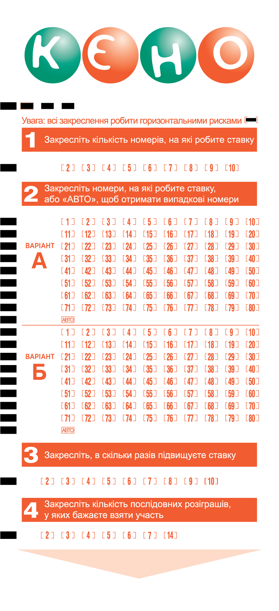 Ви можете вибрати від 2 до 10 номерів. Вартість білета не залежить від кількості вибраних номерів. Розмір Вашого виграшу залежить від кількості вибраних і вгад …
