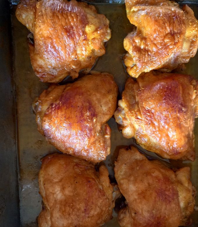 Приготуйте маринад. Для цього в мисці змішайте мед, соєвий соус, олію, приправу до курки, часник сушений. Потім змастіть всі бедра в маринаді і залиште на 2 години маринуватися. Випікати при 170 градусах 45 хвилин.