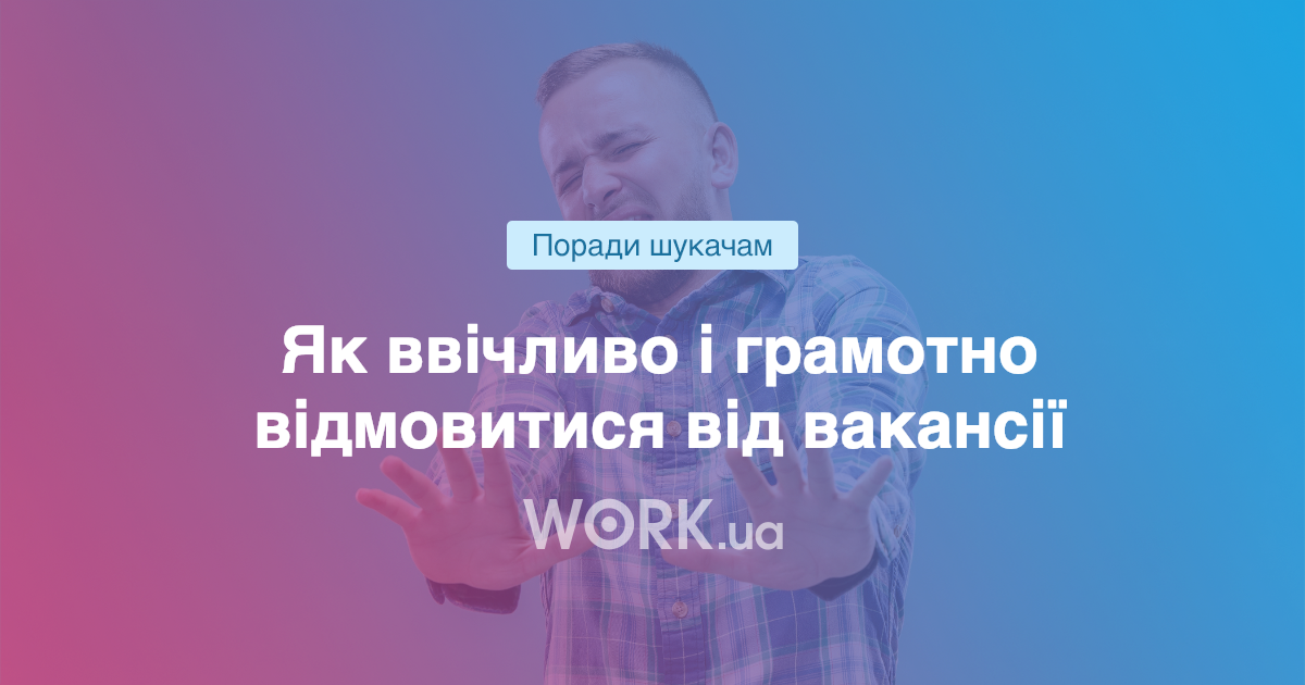 Відмова після співбесіди Повідомити про своє рішення можна повідомленням або листом. Але обовʼязково проконтролюйте, щоб його прочитали, а значить – дали вам відповідь. Якщо її немає, зателефонуйте рекрутеру. Більш детальне обговорення умов праці та обовʼязків відбувається вже на співбесіді.