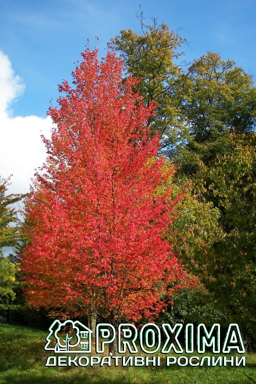 Восени клен червоний дуже виділяється на тлі інших дерев, так як в цей час набуває яскравого, насиченого червоного забарвлення листя. Форма: листопадне дерево середніх розмірів з яйцевидною або пірамідальною кроною, часто багатостовбурне.