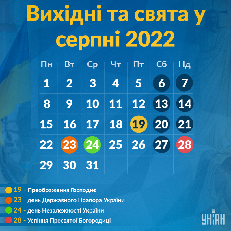 24 серпня – День Незалежності України. 25 серпня – День шахтаря. 29 серпня – День пам'яті захисників України. 31 серпня – День авіації України, День далекобійника.