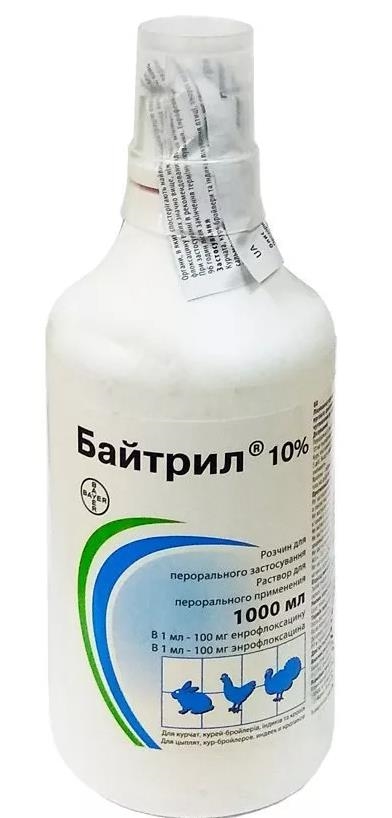 Байтрил 10% розчин для орального застосування, в дозі 10 мг енрофлоксацину на 1 кг живої маси птиці, в добу з питною водою, що відповідає 5 мл препарату на 10 л води. Лікування проводять протягом 3 днів, а при сальмонельозі протягом 5 днів.